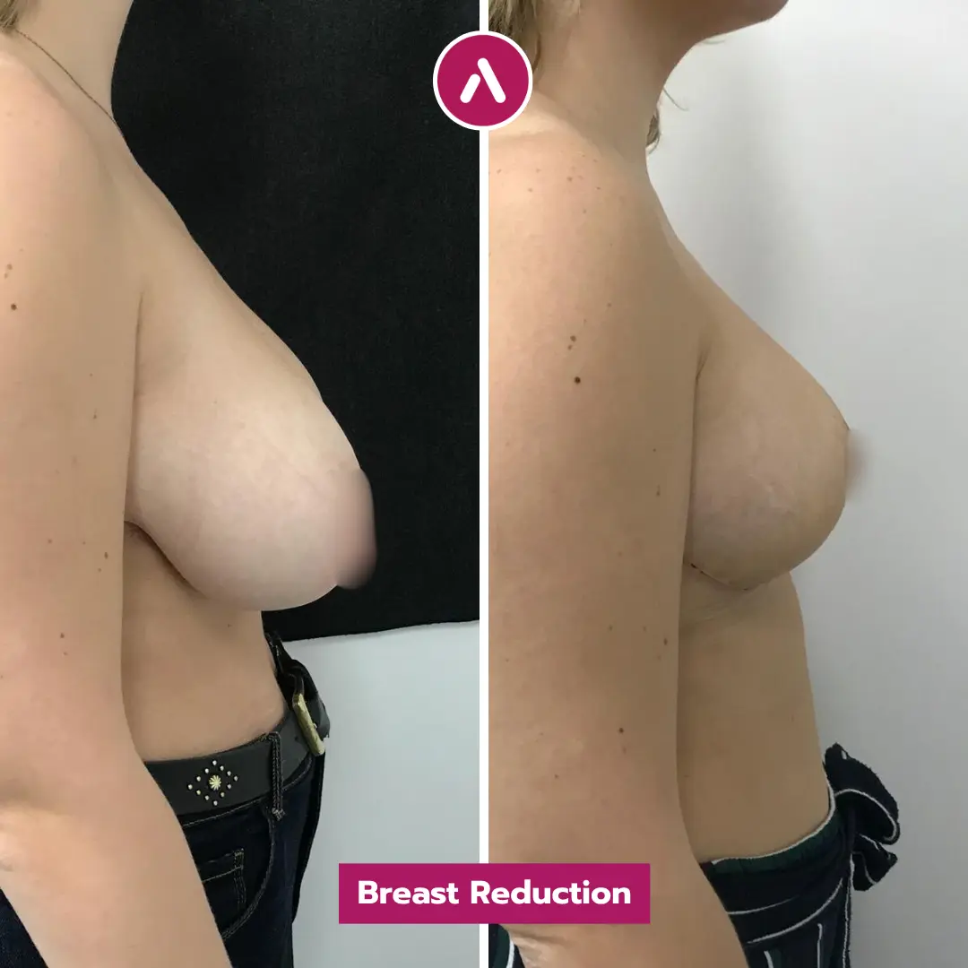 Results Analysis: The breast reduction surgery before after transformation reveals a dramatic restoration of the patient’s body proportions: