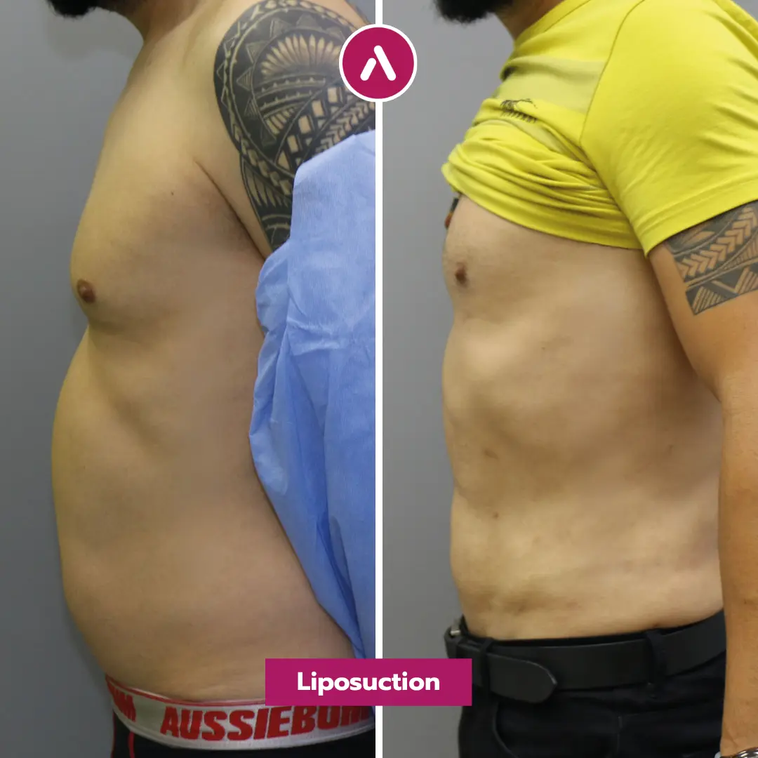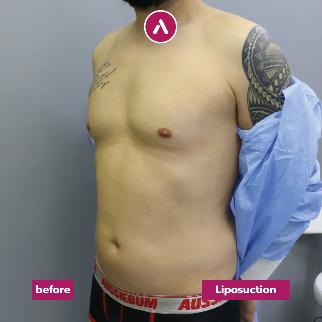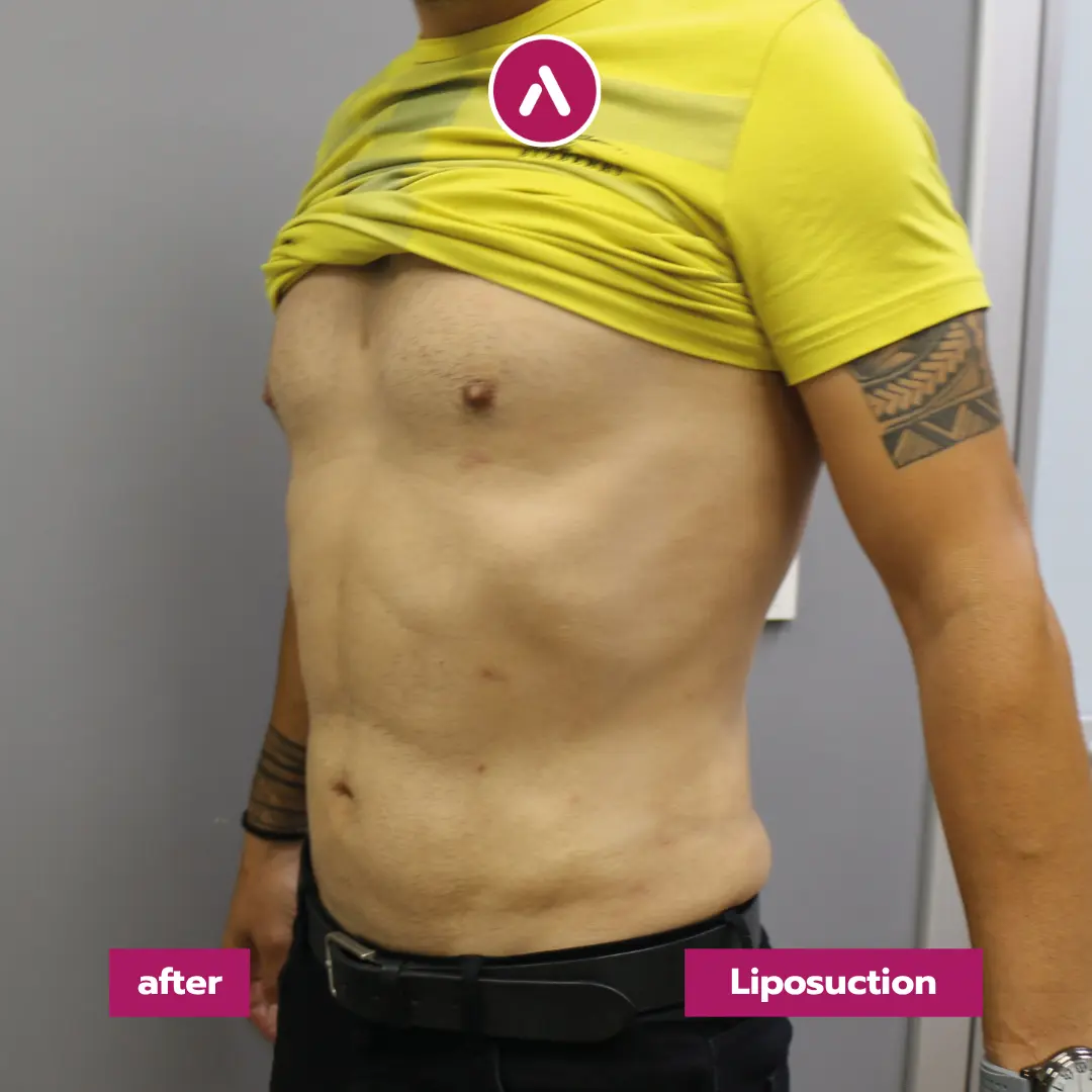 - Masculine Sculpting: Unlike female liposuction which often aims for an hourglass curve, the goal here was to straighten the flanks and flatten the abdomen to accentuate the pectoral and abdominal muscles.