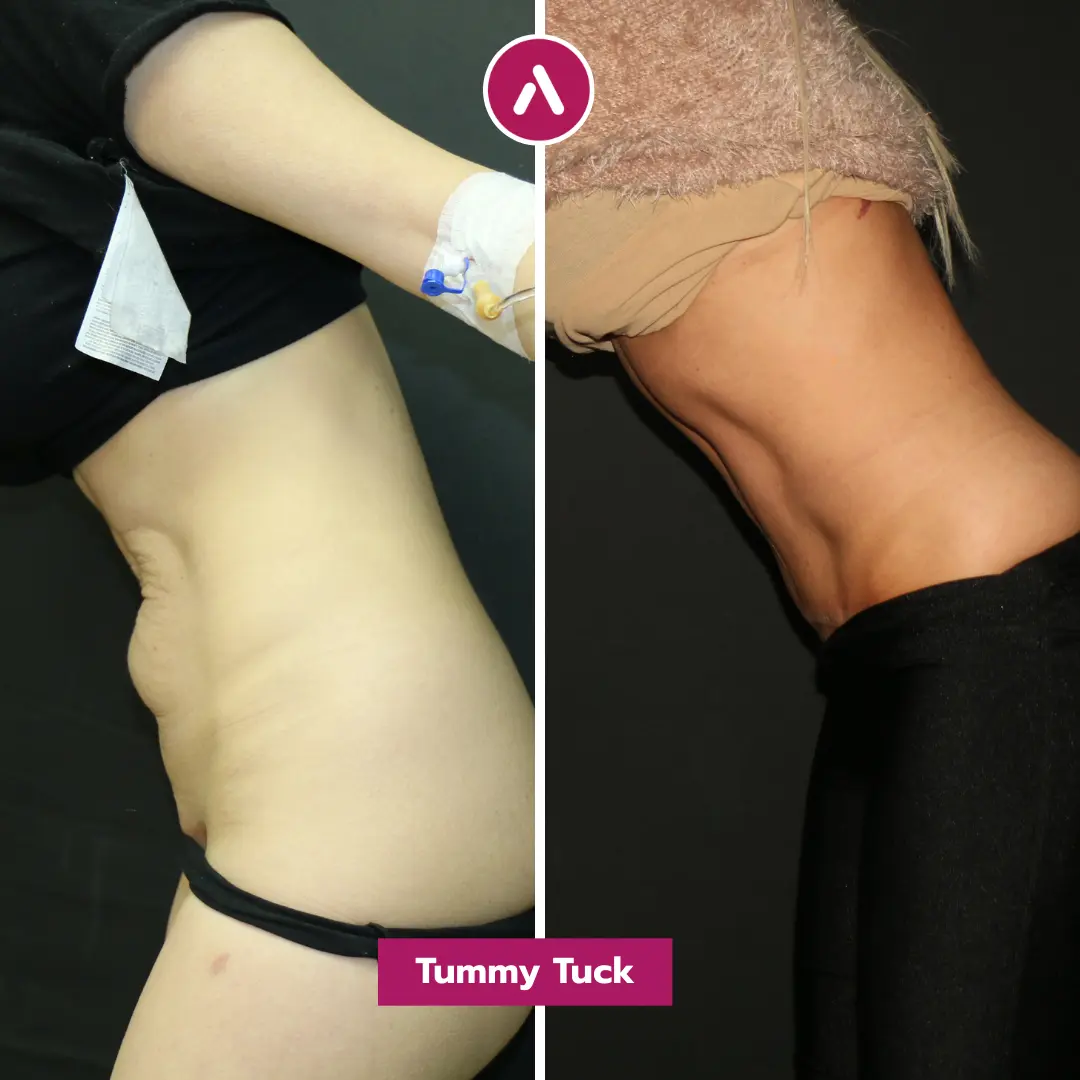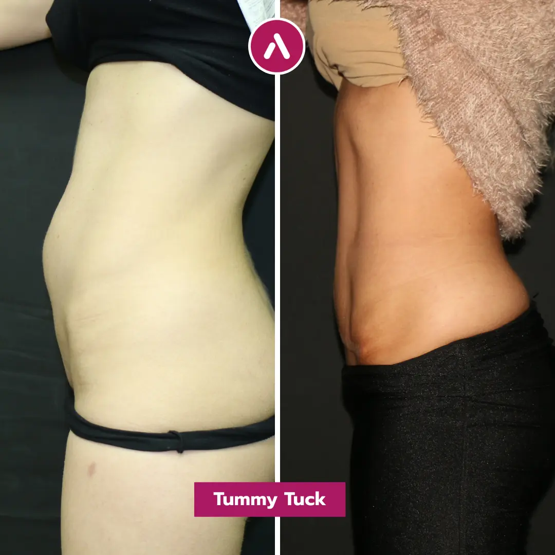 - The Profile Reset: In the before and after abdominoplasty images, the lateral view shows the total elimination of the lower abdominal “pouch.” The abdomen is now flat, with a sharp transition from the torso to the hips.