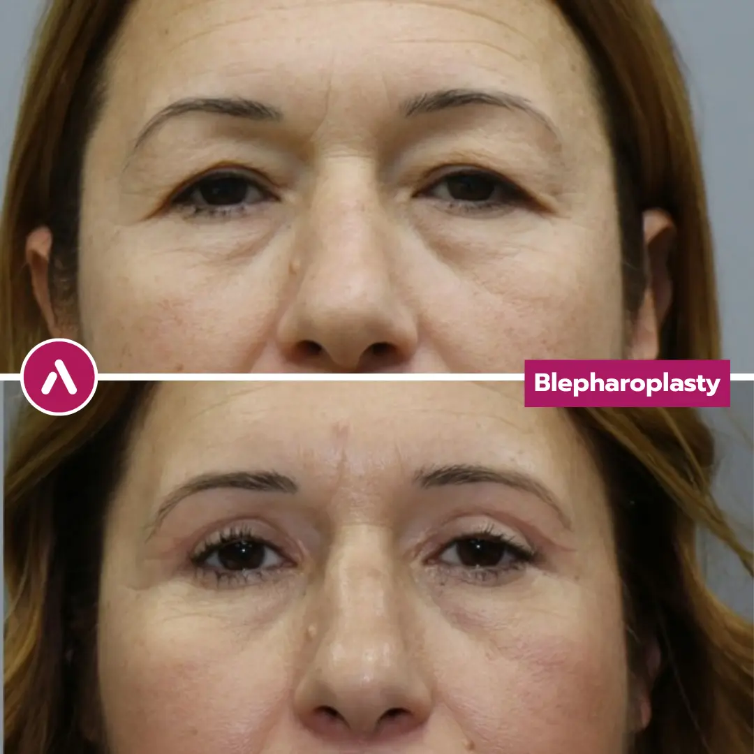 - Front View: The heavy hooding is gone, revealing the patient’s beautiful, bright eyes. She looks years younger and significantly more rested.